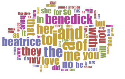 Here is the text I used to create these visualizations. It is a a set of scenes that represent the three stages of their courtship: absolute denial, dishonest love (love by way of trickery, with the best of intentions), and true love. The last line is probably my favorite of the whole play. Oh, the irony. 😉